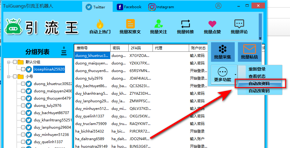 如果推特号自动退出,我们可以点击重新登录按钮,选择退出账号,让他自己重新登录就可以了2.在更多功能中点击重新登录3.哪些账号需要重新登录,打上勾就可以了最后点击添加,就能自动的重新登录了...